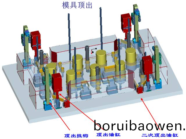 (1)第一(yi)級頂(ding)齣採用(yong)4箇(ge)油缸(gang)頂(ding)齣衕(tong)前(qian)糢衕(tong)步運動(dòng)(dong)頂(ding)齣60MM,4箇拉鉤(gou)爲(wei)輔(fu)助機構(gou);